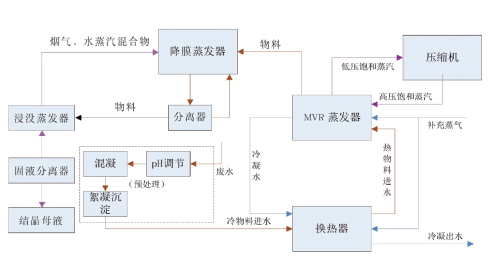 MVR processing technology, also known as mechanical steam compression technology, is a new type of energy-saving evaporation technology. Its working process involves low-temperature steam being compressed by a compressor, increasing temperature and pressure, and increasing heat concentration before entering the evaporator for heat exchange and condensation, in order to fully utilize the latent heat energy of steam vaporization. Therefore, in the evaporation process, the high-efficiency evaporator no longer requires a large amount of steam as the main heat source, only steam with less than 10% evaporation capacity is needed as supplementary steam to compensate for inevitable heat exchange losses and system heat dissipation.