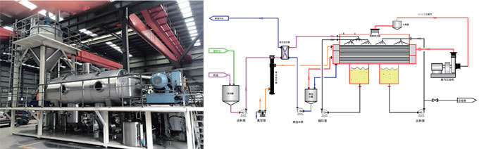 The horizontal tube falling film evaporator is a liquid distribution device that evenly sprays the feed liquid onto the horizontal tube bundle, forming a liquid film on the outer surface of the tube. Due to gravity, the liquid film flows downward along the outer wall of the tube, and the saturated heating medium inside the tube transfers heat to the medium outside the tube through the tube wall. It has the characteristics of high heat transfer efficiency, small temperature difference loss, short material heating time, low deterioration, low energy consumption, and small equipment volume. Suitable for low viscosity media and insensitive to foaming phenomena that occur during evaporation.