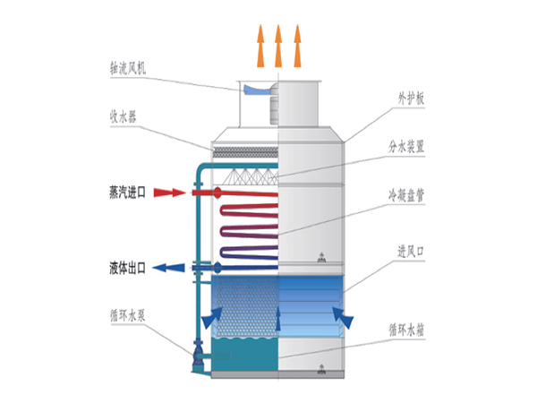 蒸發(fā)式冷凝器是利用管外水膜蒸發(fā)帶走管內乏汽凝結放出熱量的—種節能、節水型設備。